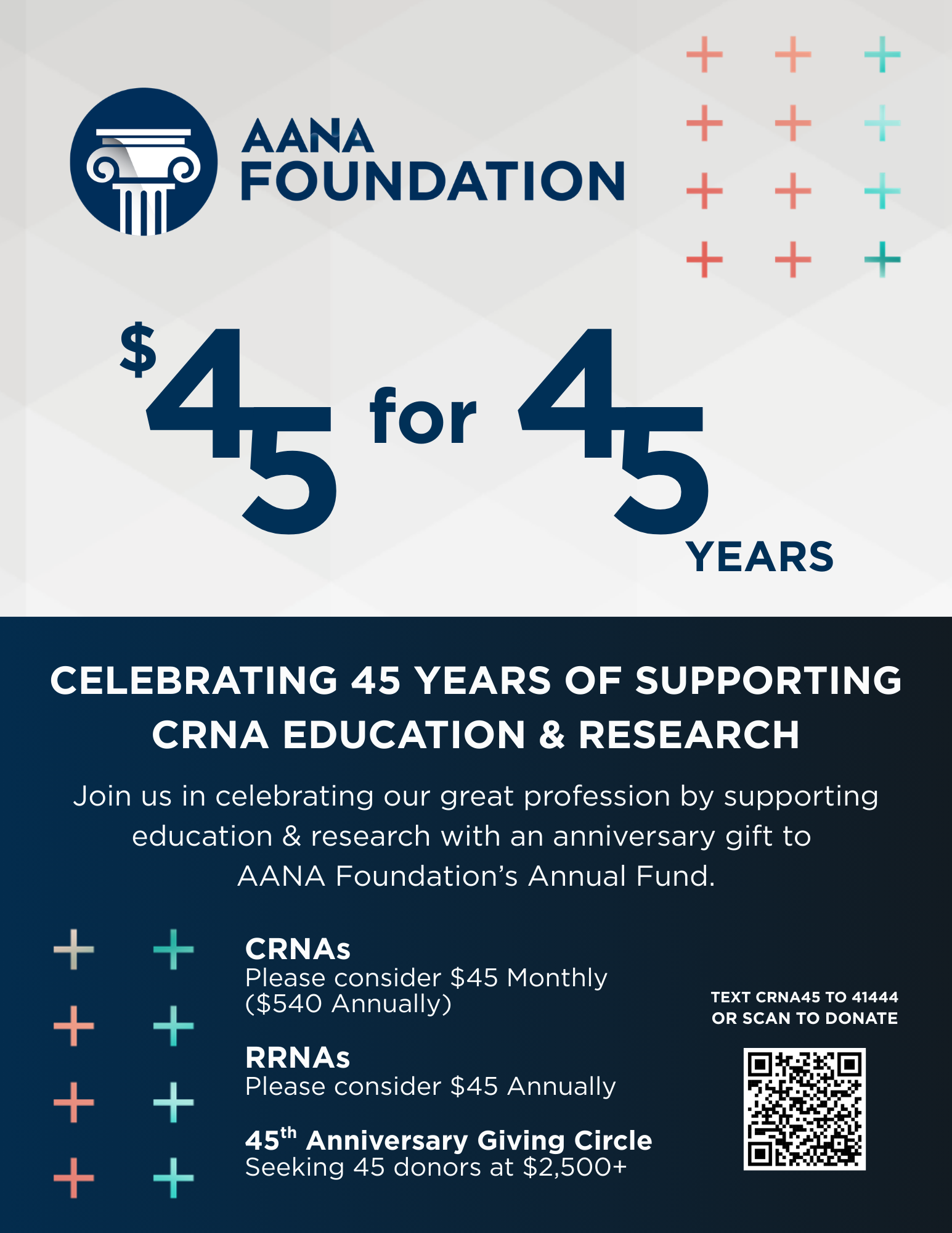 The 45th Anniversary Giving Circle celebrates donors who committed $2,500 in honor of AANA Foundation’s 45 years of impact.
