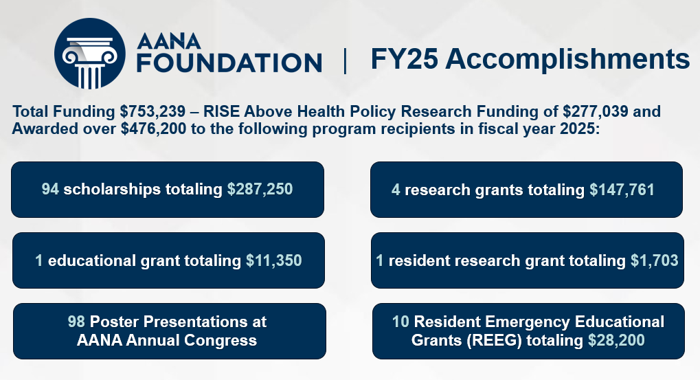 To support this vital workforce, AANA Foundation invests in education and research through scholarships, grants, and programmatic support. We partner with CRNAs and supporters nationwide to drive meaningful impact and ensure a strong future for nurse anesthesiology. This support is delivered through a range of programs and research initiatives, as highlighted in the graphic.